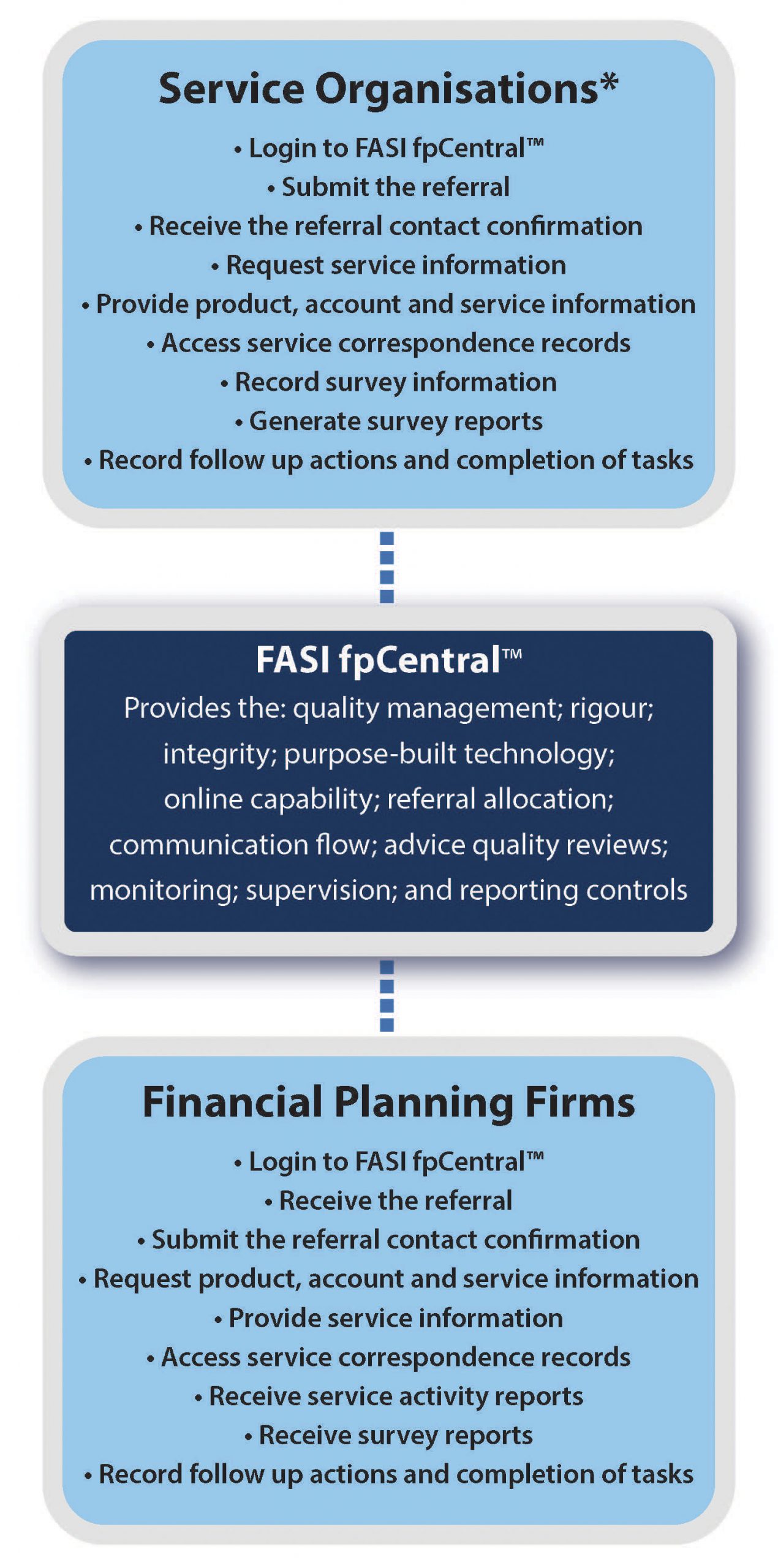 The first step for Service Organisations and Financial Planning Firms is to contact FASI to Register your interest in the FASI fpCentral™ National Referral Platform. This will be followed with a prompt response and conversation to discuss your interest, needs and service objectives.